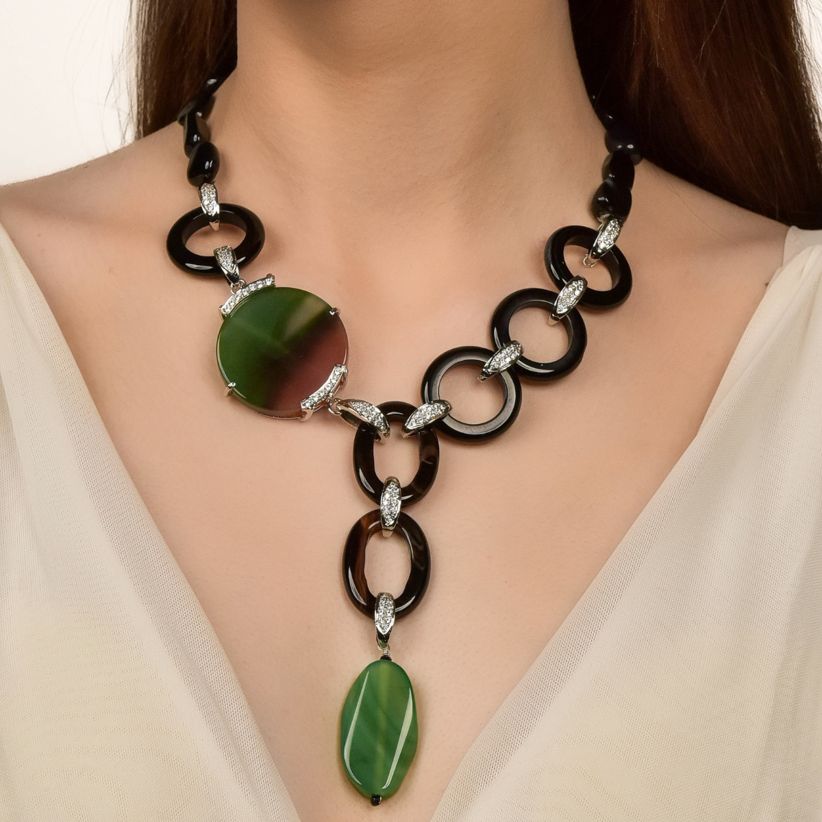 Stones: Black Onyx round and oval rings, Green & Red Onyx round, Green Onyx oval & American diamonds set in a necklace.