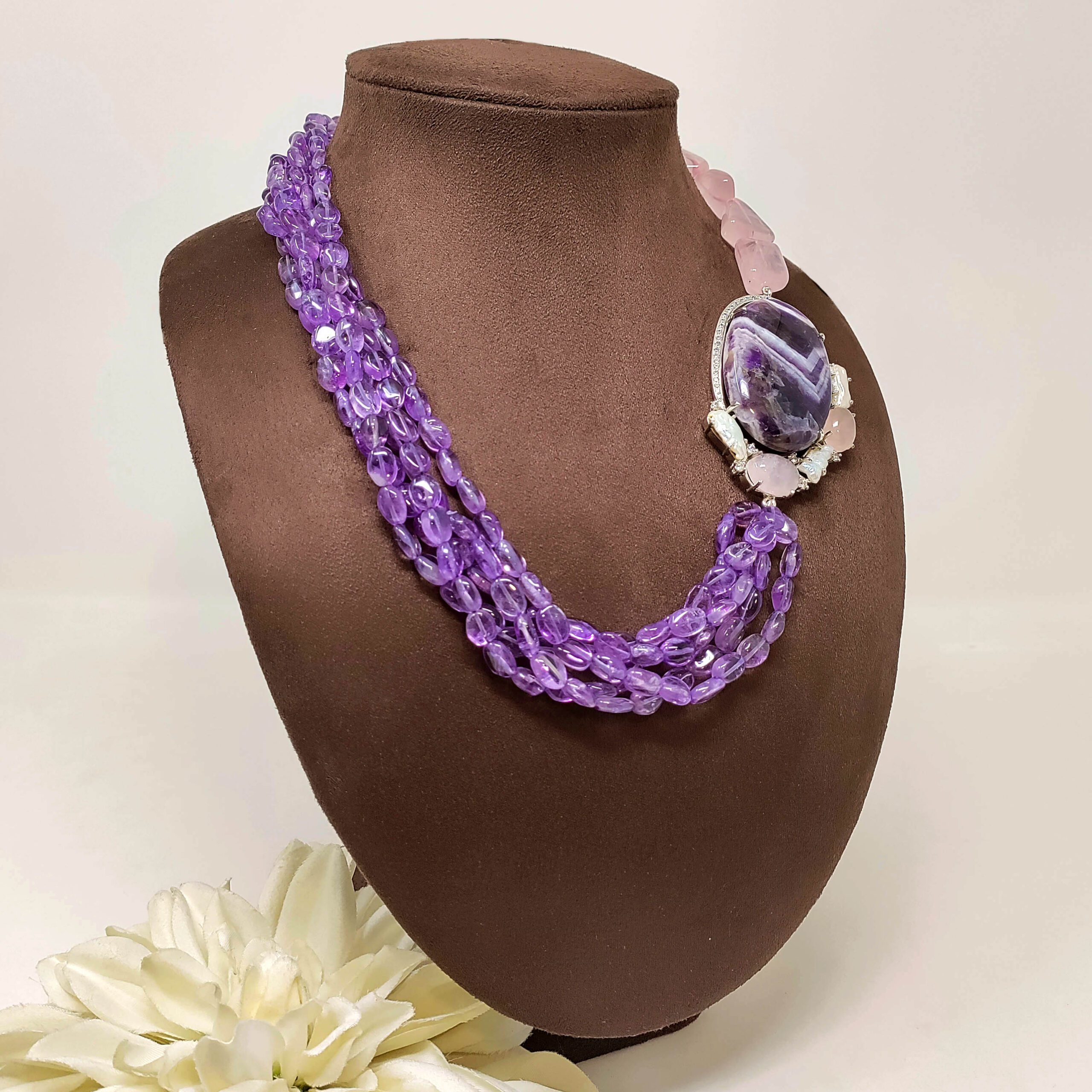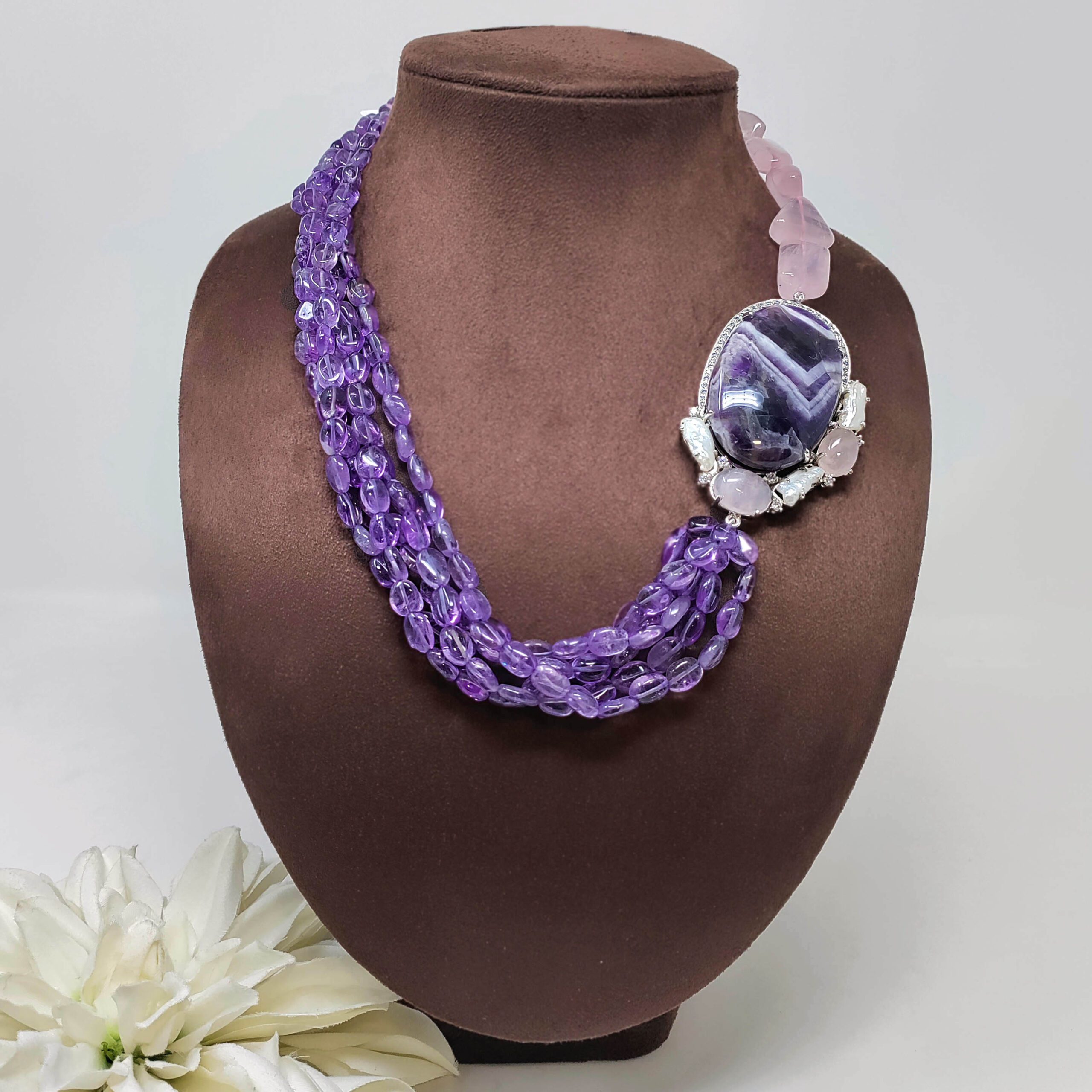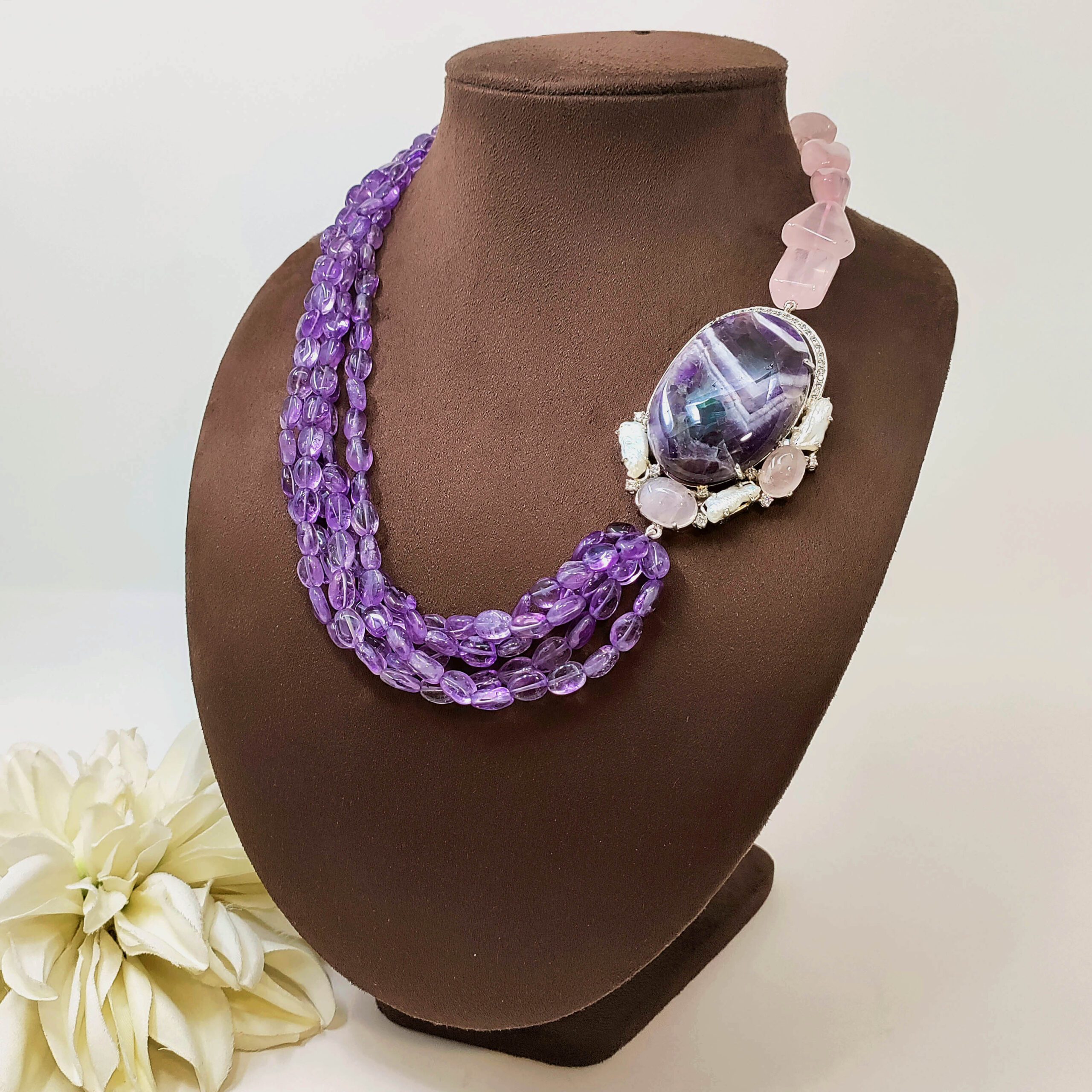 Stones: Amethyst pear, Baroque Pearl, Rose Quartz oval & American Diamonds set in a brooch with Rose Quartz beads & Amethyst beads strings.